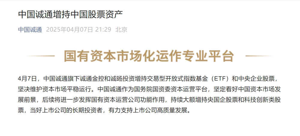 据新华社,记者从中国诚通控股集团有限公司获悉,4月7日,中国诚通旗下诚通金控和诚旸投资增持交易型开放式指数基金(ETF)和中央企业股票,坚决维护资本市场平稳运行。中国诚通表示,作为国务院国资委资本运营平台,坚定看好中国资本市场发展前景,后续将进一步发挥国有资本运营公司功能作用,持续大额增持央国企股票和科技创新类股票,当好上市公司的长期投资者,有力支持上市公司高质量发展。