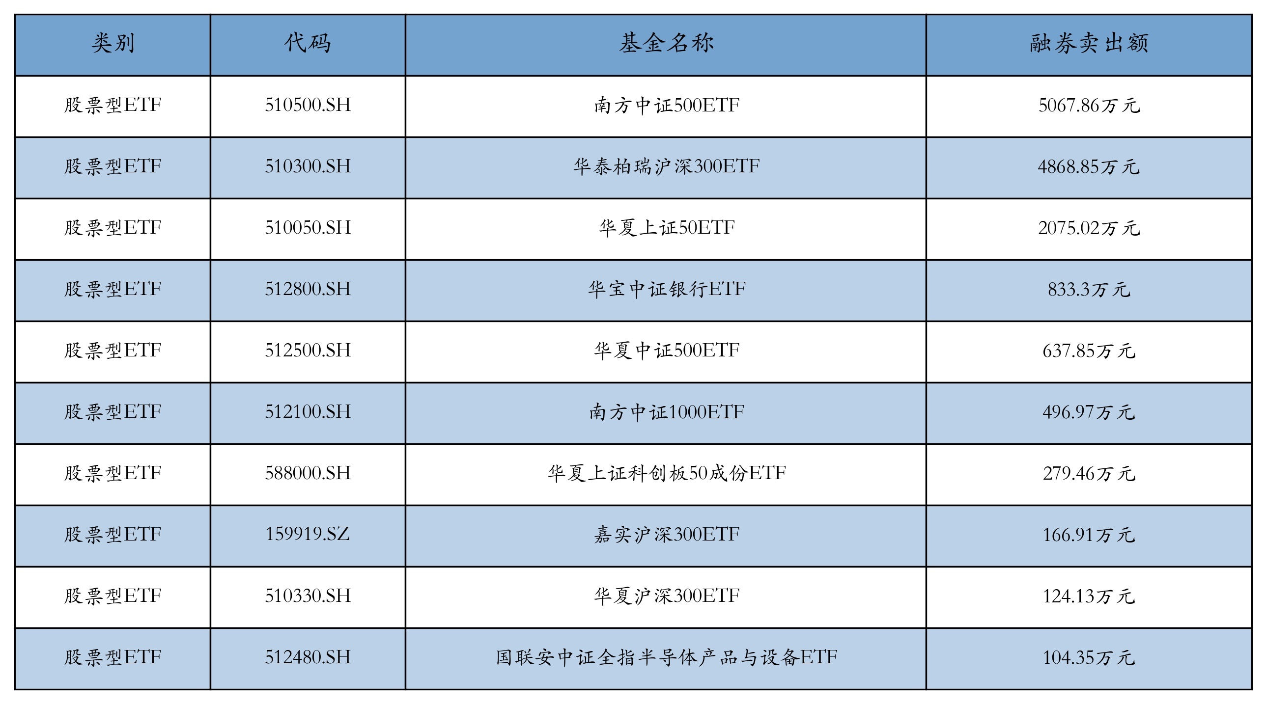 昨日股票型ETF融资卖出额最高的3支ETF及其卖出金额分别为:南方中证500ETF(5067.86万元)、华泰柏瑞沪深300ETF(4868.85万元)、华夏上证50ETF(2075.02万元)。融券卖出额前10详情见下表: