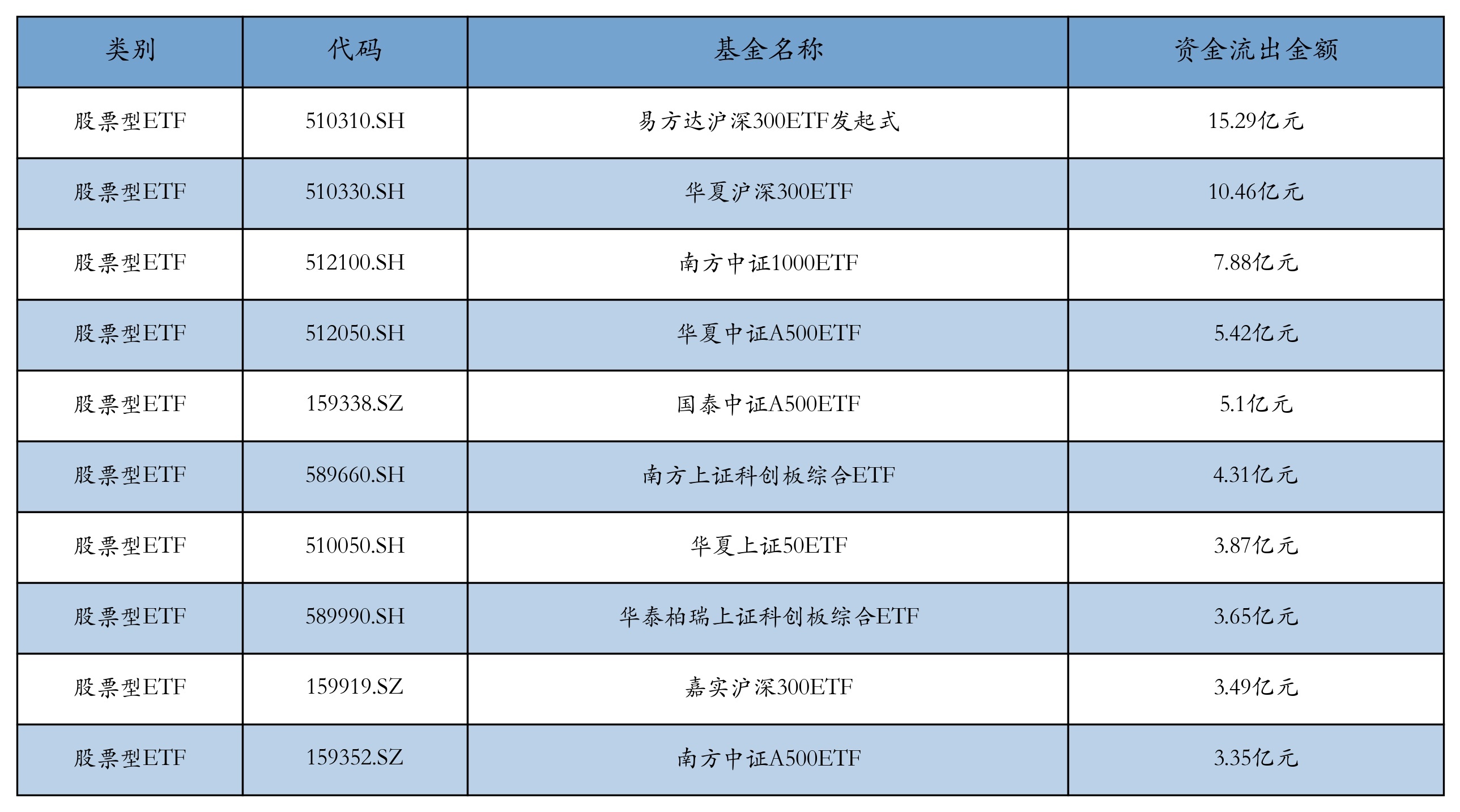昨日股票型ETF资金流出最多的3支ETF及其流出金额分别为:易方达沪深300ETF发起式(流出15.29亿元)、华夏沪深300ETF(流出10.46亿元)、南方中证1000ETF(流出7.88亿元)。资金流出前10详情见下表: